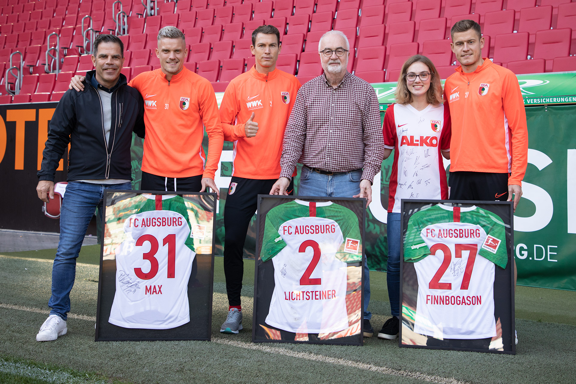Die Trikots von Stephan Lichtsteiner, Torschütze Alfred Finnbogason und Philipp Max waren nach der Partie gegen die Bayern verlost worden. Am Freitagnachmittag überreichten die FC Augsburg-Profis den drei Gewinnern Katharina, Winfried und Markus am Spielfeldrand der WWK ARENA ihre unterschriebenen Trikots. Anschließend hatten die drei Mitglieder noch die Gelegenheit, die Trainingseinheit auf dem Platz zu verfolgen.