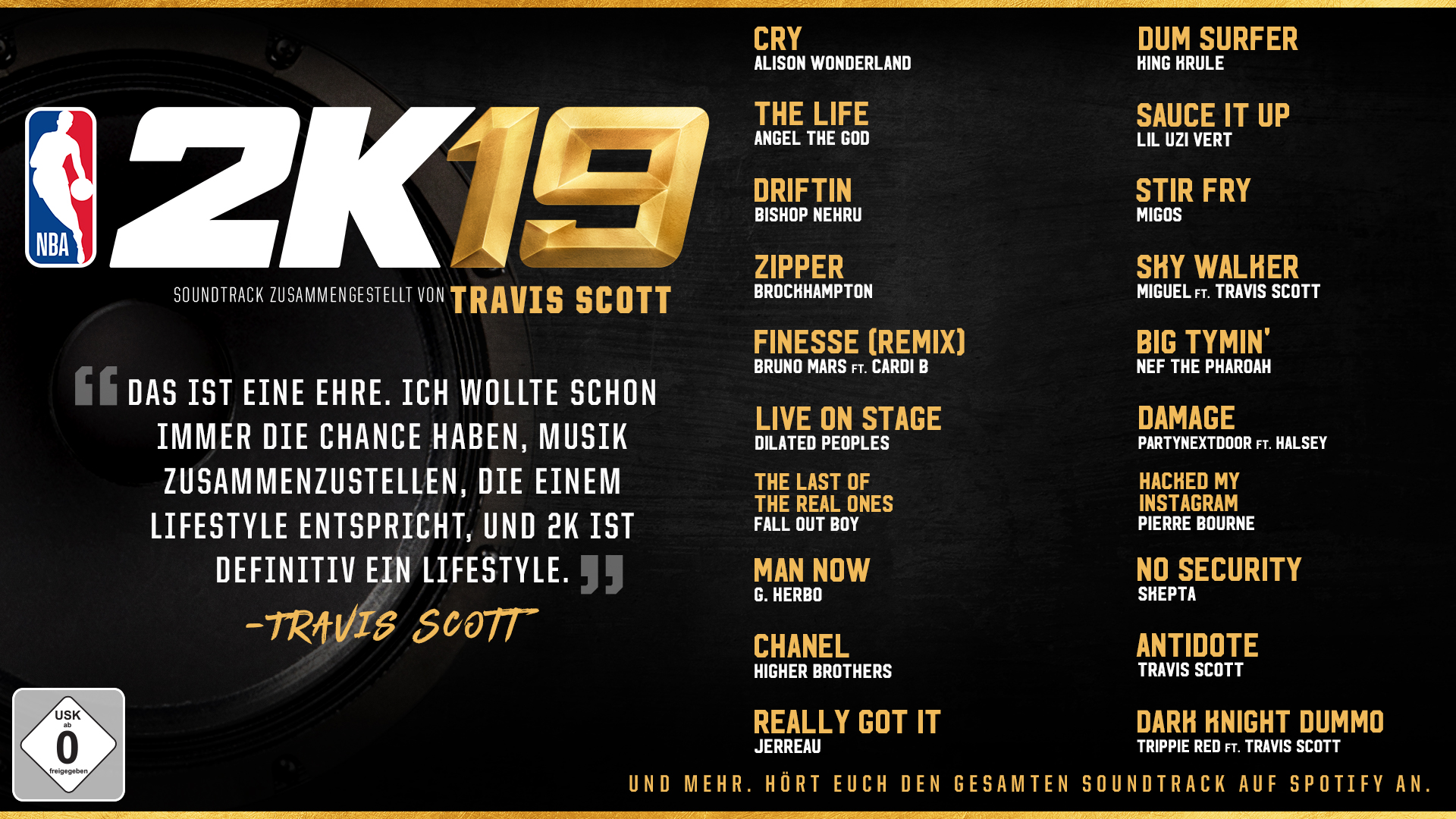 Eine Infografik mit der Trackliste des NBA 2K19-Soundtracks und einem Zitat von Travis findet ihr anbei.