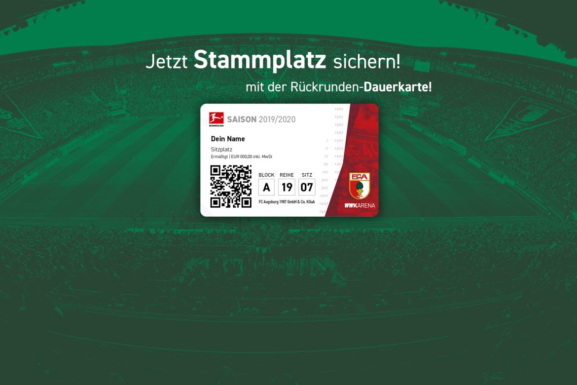 Am Mittwoch, 20. November, (9.30 Uhr) startet der FC Augsburg sein Angebot für das Abonnement einer Rückrunden- Dauerkarte. Wie in den vergangenen Jahren sind in der Rückrunden-Dauerkarte alle neun Rückrunden- Partien inbegriffen. Für die Topspiele gegen Borussia Dortmund (Samstag, 18. Januar, 15.30 Uhr), Borussia Mönchengladbach (28. Februar – 1. März) und Rasenballsport Leipzig (Samstag, 16. Mai, 15.30 Uhr) müssen die Anhänger hierbei keinen Topspiel-Zuschlag zahlen. Die Rückrunden-Dauerkarte ist ausschließlich als Abonnement.